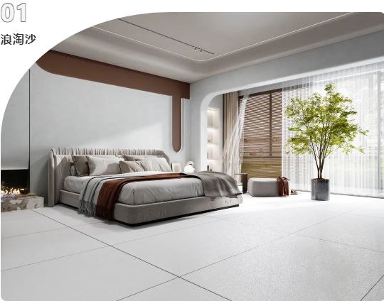 地面選用750x1500mm黃金規格的浪淘沙進行通鋪,簡潔的線條設計與不同材質交匯融合。不僅讓空間更具擴張力和延展力,清新淡雅的綠植作為點綴,猶如置身大自然,仿佛呼吸中亦有抵達心底的治愈。