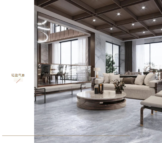 經典的布藝沙發、木紋飾面的天花吊頂、淺色系軟裝窗簾,雨霖鈴在空間中自由擴展,錯落有致的紋理,每一筆都仿佛是大自然的鬼斧神工。將細節放大,白、灰的點綴結合柔拋工藝,令客廳的質感和層次感躍然而生,柔美、濃郁,又不失秋的輕盈氣息。